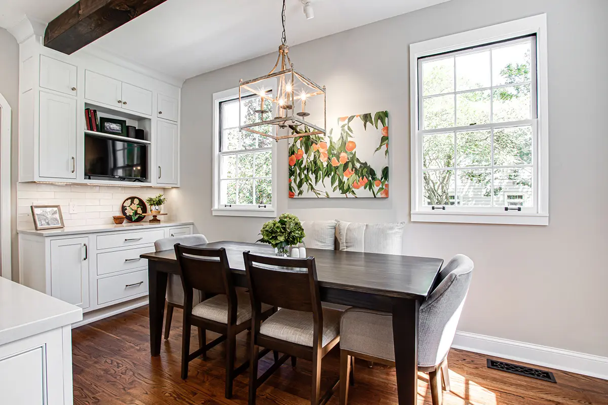 The biggest challenge in this remodel was reconfiguring the layout to include a large island that could serve as both a breakfast table and a central gathering space, while also providing more cabinet storage. To maximize functionality, a bench seat under the window was added for extra storage and to visually extend the island, making the kitchen feel open all the way to the family room rather than stopping at the windows.